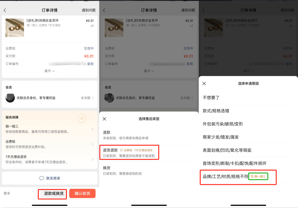 服务入口 | ①【退款或换货】-【退款】-【我已收到商品】-【假一赔三标签的售后原因】 ②【退款或换货】-【退货退款】-【假一赔三标签的售后原因】 ③假一赔三申请页面 |