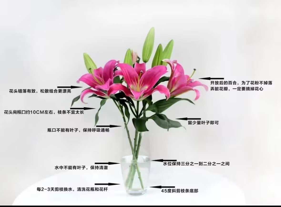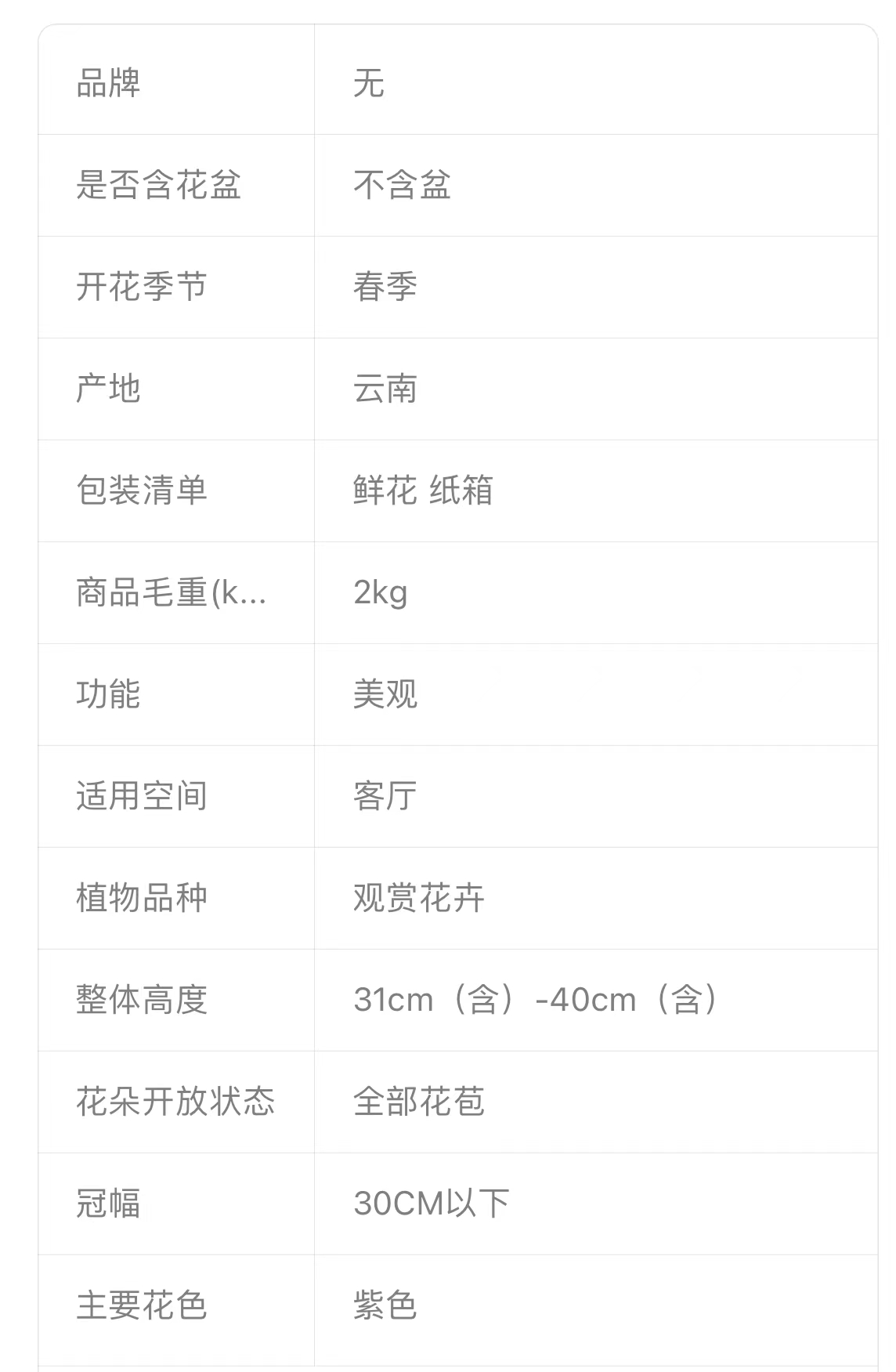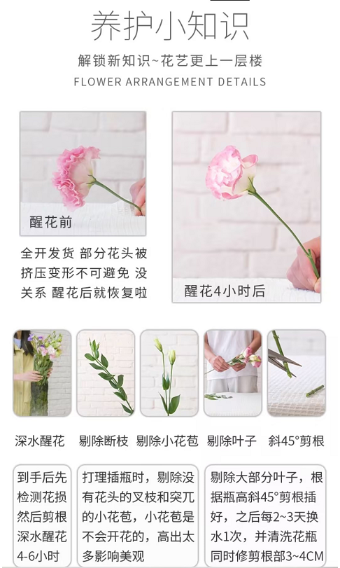 b. 鲜切花材、礼品鲜花必须描述商品基本信息:包含花材品种、颜色、数量(枝数/扎数)、花材级别、花杆高度、花头大小(直径范围)、发货时鲜花的开放度区间、多头花包含的花头数范围、是否含花瓶(礼品鲜花需说明主花材、辅材品种及颜色、包装说明、设计风格、规格尺寸)、装饰/送礼场景、一般情况下可养护的周期、 收到花后的醒花、养护步骤及方法、配送场景。 花材级别:需参考拍市核定标准,不可随意以自家标准核定,以次充好;