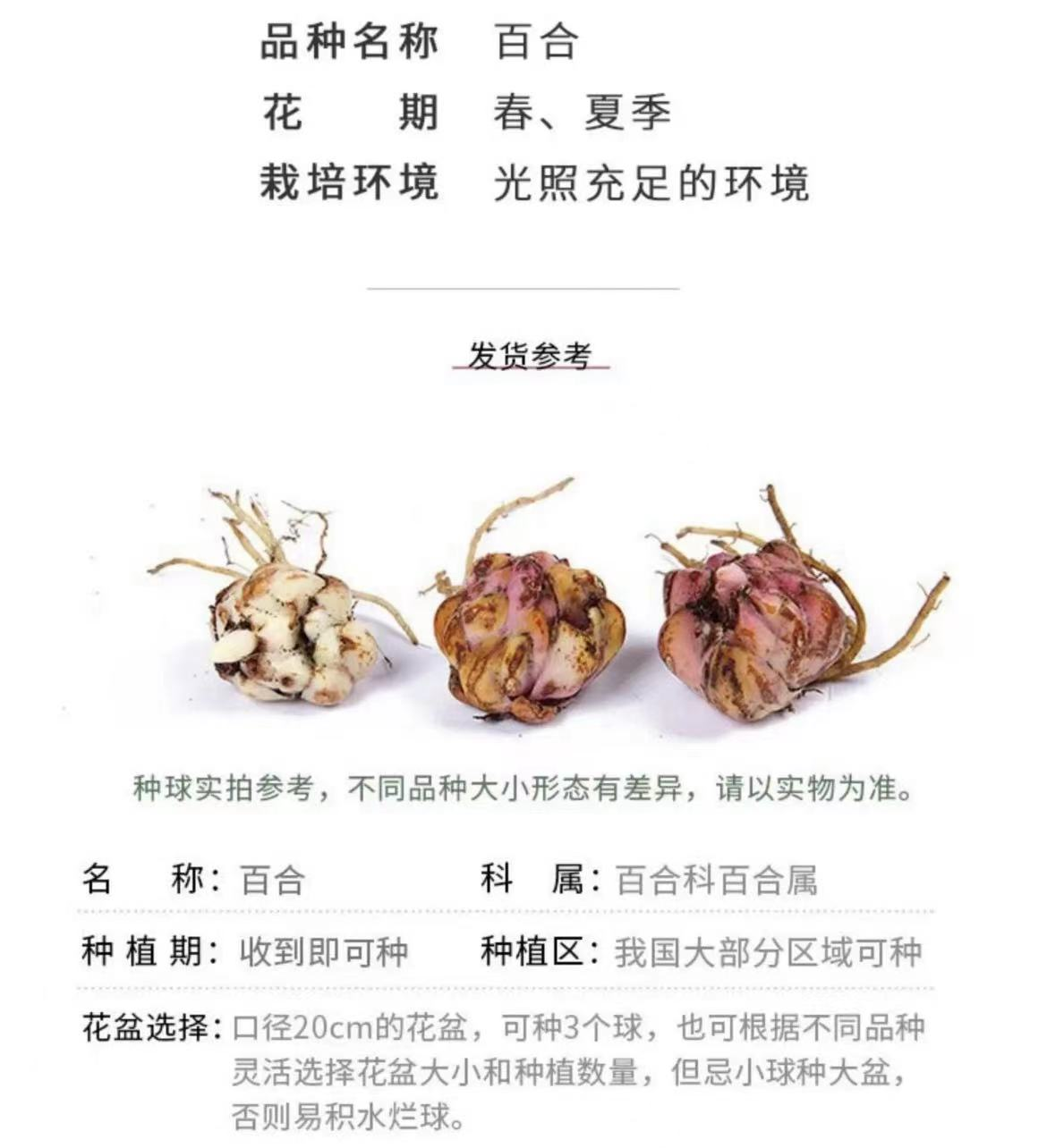 d. 种子、种球类商品商详图需要详细展示种子类别、品种名称、品种审定或者登记编号、品种适宜种植区域及季节、生产经营者及注册地、质量指标、检疫证明编号、种子生产经营许可证编号和信息代码; 此外应提供提供种子的主要栽培措施、适应性、适宜栽种环境、地区等使用条件的说明、风险提示与有关咨询服务,不得作虚假或者引人误解的宣传。